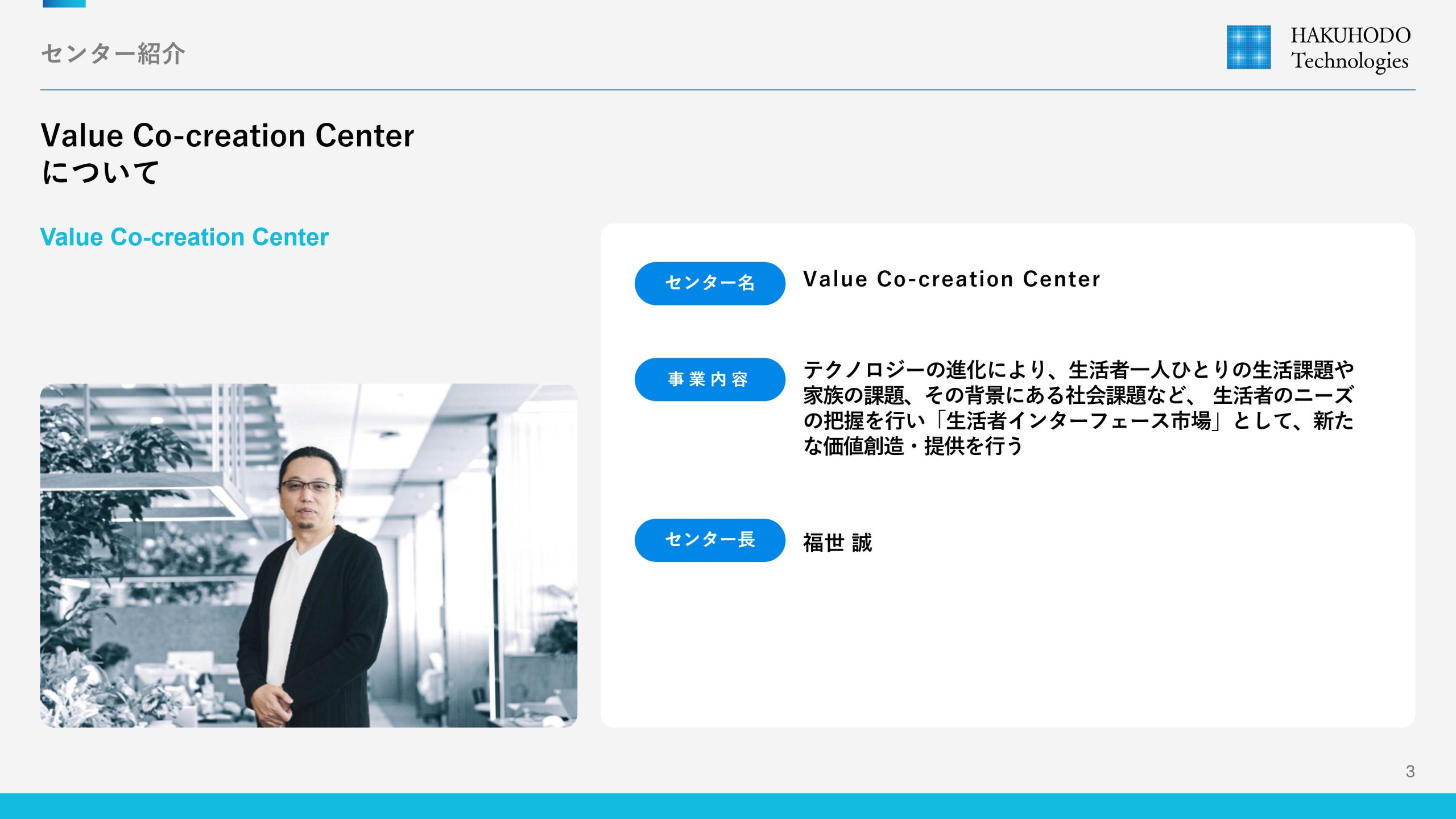 急速なテクノロジーの進展により、産業構造、ビジネス構造、ヒトの役割の再定義が進行しています。ヒトとテクノロジーの共創により、テクノロジーが人間の能力や可能性を拡張し、最大の価値を生み出すことがより重要になります。Value Co-creation Centerは「テクノロジー×マーケティング領域」をドメインとして、博報堂DYグループのマーケティング、得意先のマーケティング、生活者のマーケティング、社会全体に関わるマーケティングなど、マーケティングに関するあらゆる課題を理解し、テクノロジーとクリエィティビティの力で新たな価値創造・課題解決に取り組んでいます。
