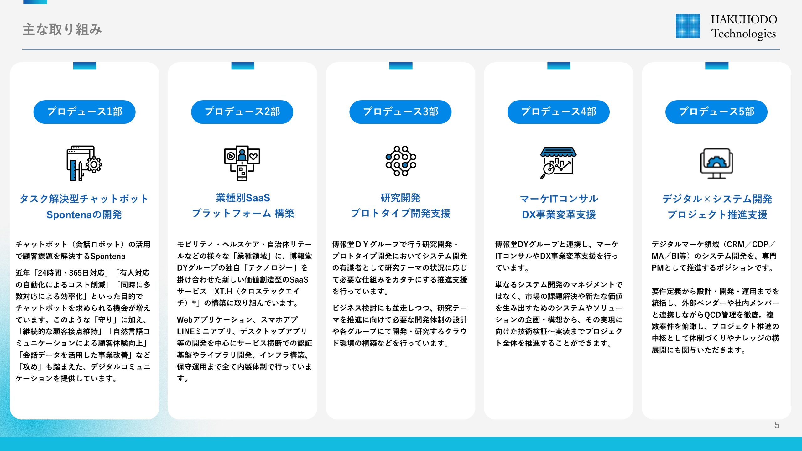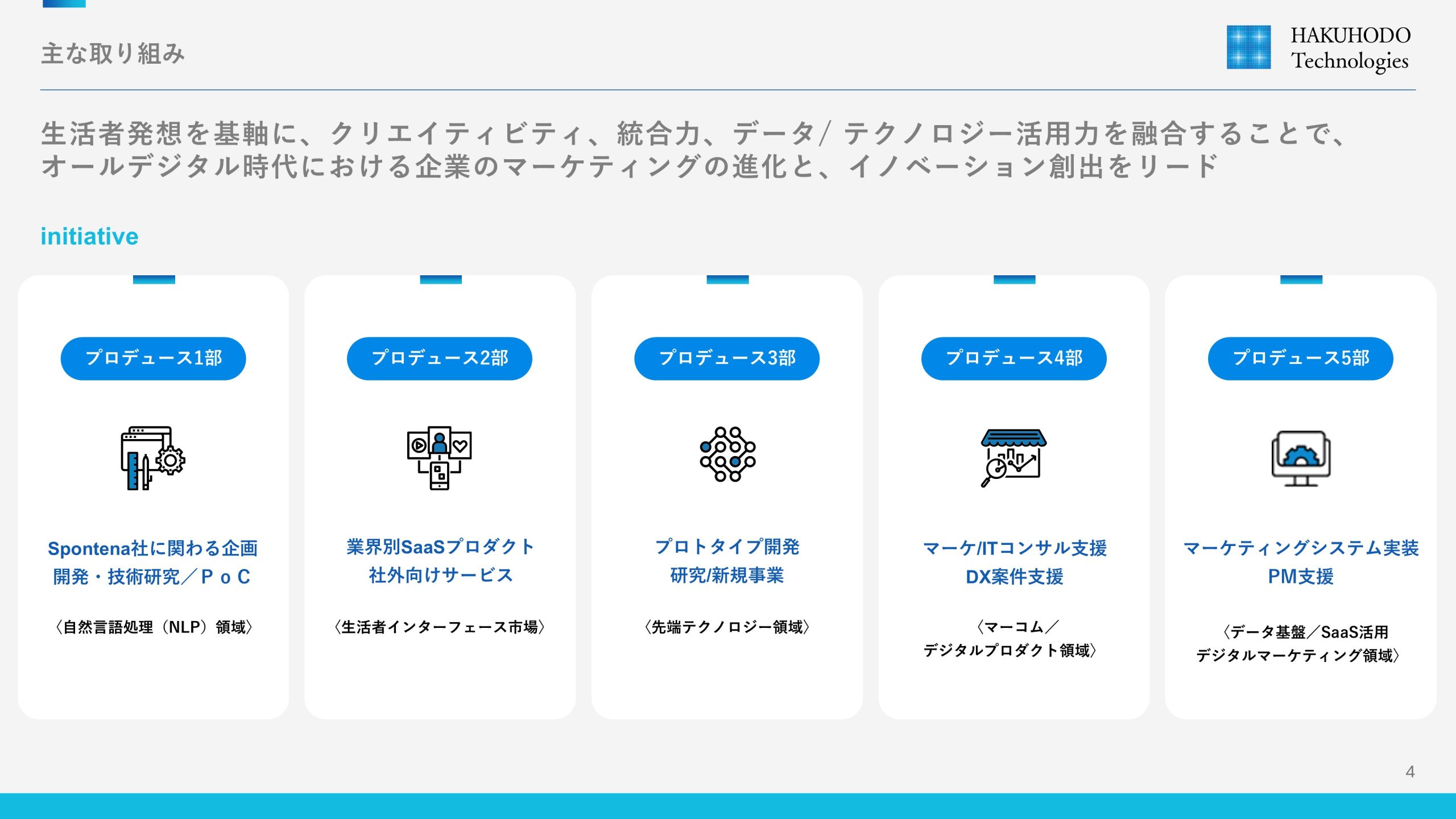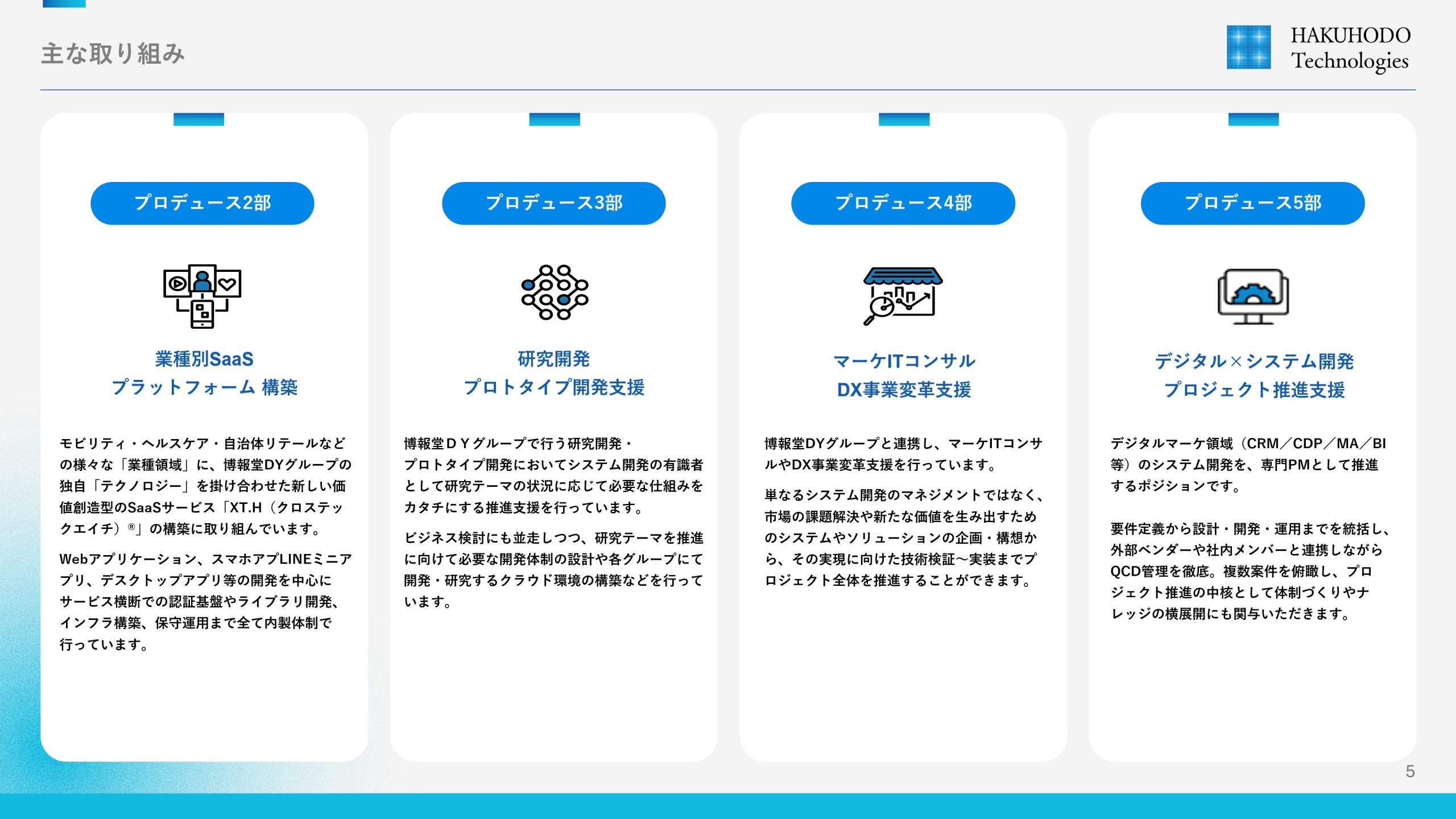 得意先もしくは博報堂DYグループの新規事業や新サービスをスピード感を持って開発します。ビジネスサイド・エンジニアリング・マーケティングといった少人数によるチーム編成で、企画・PoB・PoC等のフィジビリを重ね、事業化・サービス化の検討を行います。様々なフェーズを経て本番サービス化を実現します。例)広報と記者をつなぐ取材マッチングプラットフォーム 「Espresso Hub」