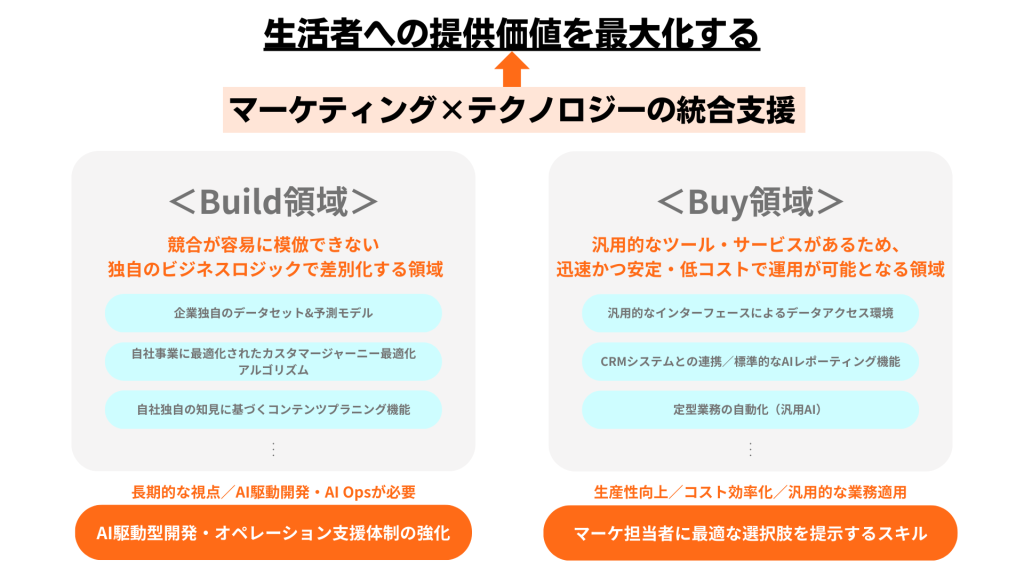 白子: そうですね。クライアントの視点では、既存のツールを買って調達する「Buy」の領域だけでなく、自社独自のAIオペレーションを構築する「Build」の領域が重要になってきます。プロデュース4部としても、「Buy」領域はもちろん、「Build」領域、つまりAI駆動型開発やオペレーション構築を支援できる体制を強化していきたいと考えています。