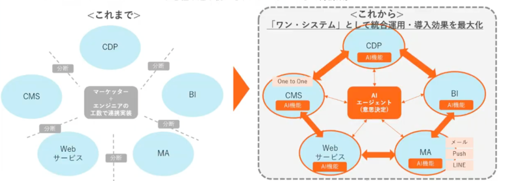 そこで我々が取り組んでいくべきことは、これまでの「最適なツールの組み合わせの支援(Best of Breed)」から、「最適なマーテク統合支援(Best of Martech Integration)」への移行です。断片化したツールを統合し、データ、意思決定、デザイン、配信の4つのレイヤーにAIエージェントを組み込み、ワンシステムとして再構築、統合運用していくことがこれからは重要になってきます。